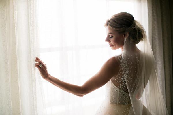 Hãy hướng dẫn cô dâu mở nhẹ rèm cửa và để cho ánh sáng xuyên vào hoặc cũng có thể sử dụng cửa sổ như một softbox (dụng cụ tản sáng) để có được một bức ảnh lung linh hơn. Đây là một shot hình tuyệt vời vì vừa có thể chụp tập trung vào cô dâu vừa có thể khoe trang phục. Lưu ý rằng luôn giữ khoảng cách giữa cánh tay và cơ thể.