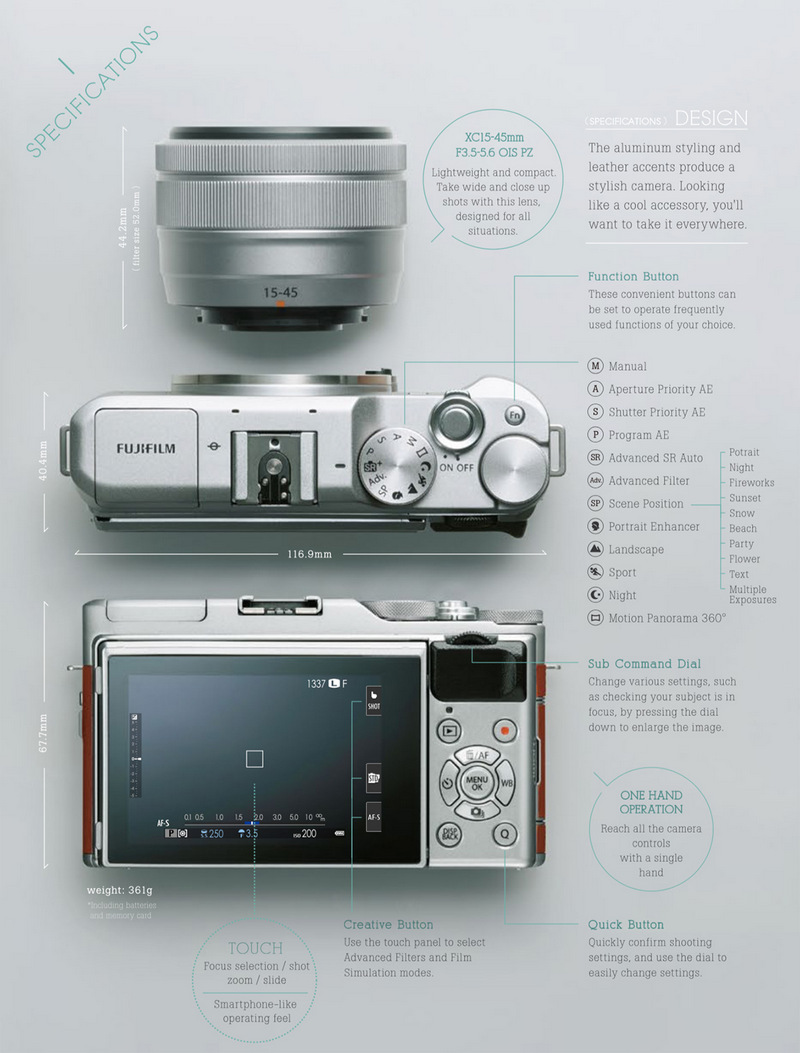 Đi kèm với X-A5 là ống kính Fujinon XC15-45mm f/3.5-5.6 OIS PZ mới được ra mắt cùng thời điểm với thân máy. Đây là ống kính zoom điện tử đầu tiên trong hệ thống ống kính X-Mount của Fujifilm, nó cho tiêu cự tương đương là 23-68mm trên khổ 35mm khá đủ cho nhu cầu chụp ảnh phong cảnh và chân dung lưu niệm.