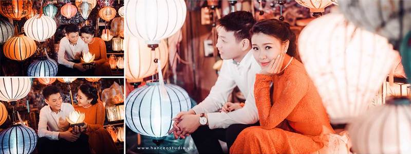 Cách thành phố Đà Nẵng khoảng 30km, Hội An cũng là địa điểm được du khách yêu thích. Thực hiện một bộ ảnh bình yên trên chiếc thuyền nhỏ trôi lững lờ trên dòng sông Hoài sẽ khiến bạn chìm đắm trong hạnh phúc. Thay vì ánh đèn điện chói chang, ánh nến lung linh sẽ giúp bạn có được bộ ảnh rất riêng, tinh tế và đầy lãng mạn.