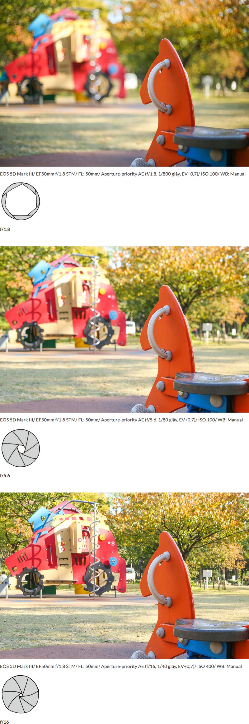- Khi số f càng lớn thì khẩu độ càng khép nhỏ lại (nói cách khác là khép khẩu độ).