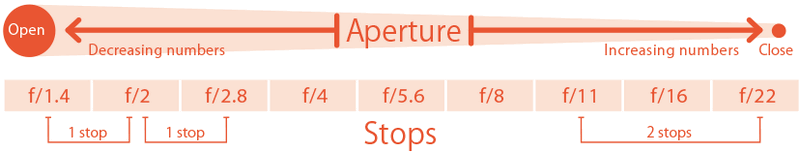 Khẩu độ cho phép chúng ta kiểm soát lượng ánh sáng đi vào ống kính. Khi mở khẩu, lượng ánh sáng nhiều hơn có thể đi vào, và ngược lại, khi khép khẩu, lượng ánh sáng ít hơn có thể đi vào ống kính. Giá trị chữ số về chênh lệch khẩu độ được gọi là số f. Các số f tiêu chuẩn là: f/1.4, f/2, f/2.8, f/4, f/5.6, f/8… v.v. Mở khẩu sẽ giảm số f trong khi khép khẩu sẽ tăng số f.